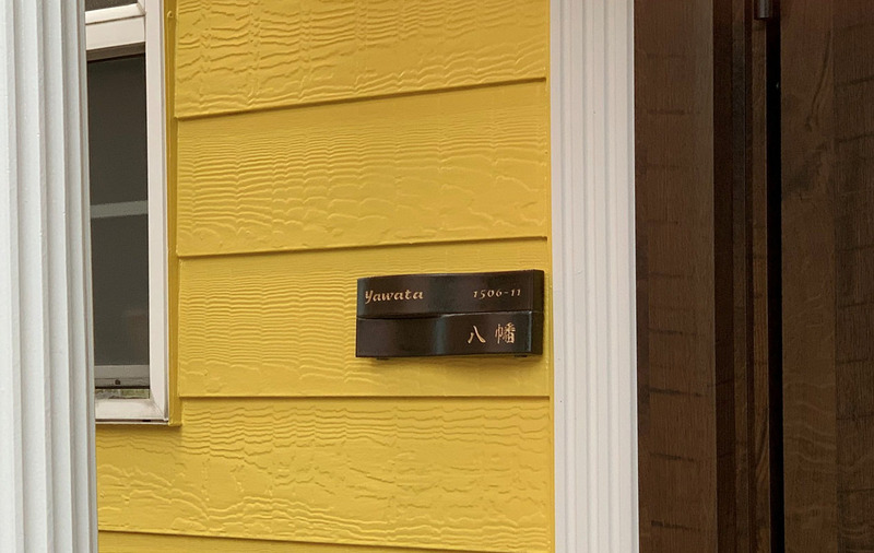 本来は玄関ドアに設置するつもりで注文したのですが、 新しいドアの表面が緩いアール状となっており、 またドアの材質との関連から 工務店の方と相談した結果写真位置の場所しかないだろうという結果になりました。 若干目立たない位置ではありますが ご近所ではまだ見たことのない洗練された表札でしたので ちょっと鼻高(笑)です。 ありがとうございました。